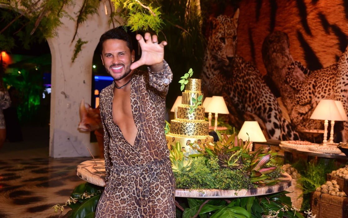 O tema da festa escolhido pelo influencer foi “selva” e os convidados foram vestidos a caráter para combinar com a temática do evento.