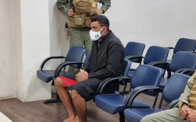 Daniel Galdino Dias, acusado de matar dois adultos e duas crianças da mesma família, no crime que ficou conhecido como ‘chacina de Guaxuma’, senta no banco dos réus nesta quinta-feira (24).