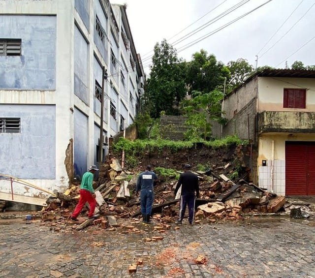 Agentes da Defesa Civil e da Secretaria de Serviços Públicos da Prefeitura de Penedo trabalham nas áreas mais afetadas do bairro Santo Antônio, popular Barro Vermelho. Na Rua São Vicente, na Vila São Francisco, parte do calçamento da via pública cedeu.