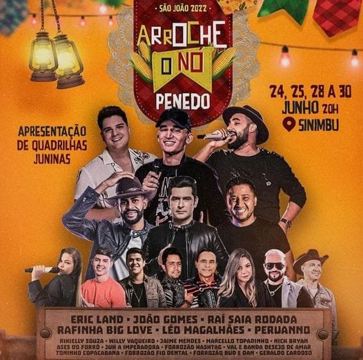 A Prefeitura Municipal de Penedo, através da Secretaria Municipal de Cultura anunciou na tarde deste domingo (22), a Programação do São João 2022 ( Arroche o Nó) a ser realizado no espaço Sinimbu ( Orla de Penedo). veja abaixo:
