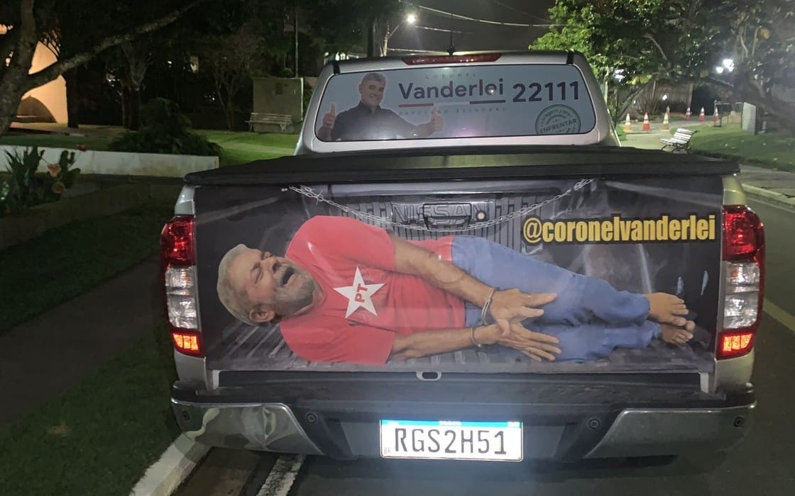 Candidato a deputado estadual por Alagoas, o coronel da Polícia Militar Marcos Vinicius Rodrigues Vanderlei dos Santos foi obrigado, pela Justiça Eleitoral, a retirar plotagem da caminhonete em que mostra o ex-presidente Lula (PT) e concorrente à Presidência da República na condição de presidiário.