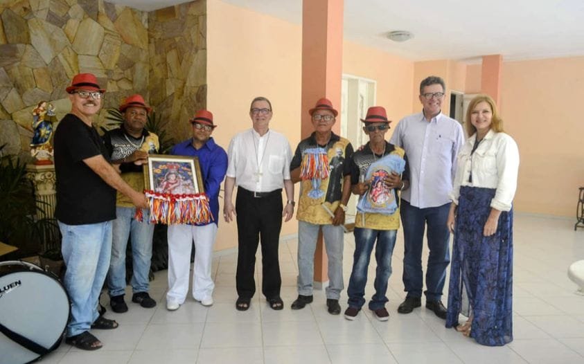Aconteceu nesse sábado na residência episcopal na presença do Bispo Diocesano Dom Valdemir Ferreira na cidade histórica de Penedo-Al, mais uma etapa do Projeto de Revitalização das Bandas de Pífano de Alagoas, iniciado pela Banda de Pífano Nossa Senhora do Pilar. Desta feita foi a vez da Banda de Pífanos Santo Antônio, procedente da Cooperativa 1º Núcleo município de Penedo. O projeto sócio- cultural em tela é uma iniciativa louvável da Dra. Maria Cecília Carnaúba, Promotora de Justiça do Ministério Público Estadual, e do médico cardiologista e professor da Universidade Federal de Alagoas, Dr. Francisco Costa. O evento que teve o acompanhamento do Site Diário Penedense na pessoa do seu redator chefe Geraldo José, registrou a entrega de toda a nova indumentária da Banda, que deverá ser usada pelos seus músicos. Segundo os coordenadores, o projeto visa a contribuir de forma efetiva para o resgate de nossas mais autênticas raízes folclóricas. Para o Dr. Francisco Costa, que é penedense, “essas bandinhas são o símbolo maior da nossa querida Festa de Bom Jesus dos Navegantes, a maior expressão de religiosidade popular do Baixo São Francisco”. Ao final do encontro houve o agradecimento dos músicos da Banda de Pífanos Santo Antonio e do Reverendíssimo Bispo do Episcopado de Penedo, Dom Valdemir, que se mostrou feliz por ser o anfitrião da visita, ao tempo em que incentivou a iniciativa e fez fervorosa exaltação do folclore brasileiro, da Santa Igreja Católica e de Nossa Senhora do Rosário, padroeira da cidade, e um dos símbolos estampados no manto da Banda.