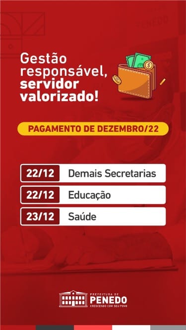 O Prefeito de Penedo acrescenta ainda que “esse foi um compromisso que assumimos e cumprimos”, desejando “um ano de muitas felicidades para todos e que no ano que vamos entrar, com certeza, vamos garantir essa antecipação do pagamento de salário.”