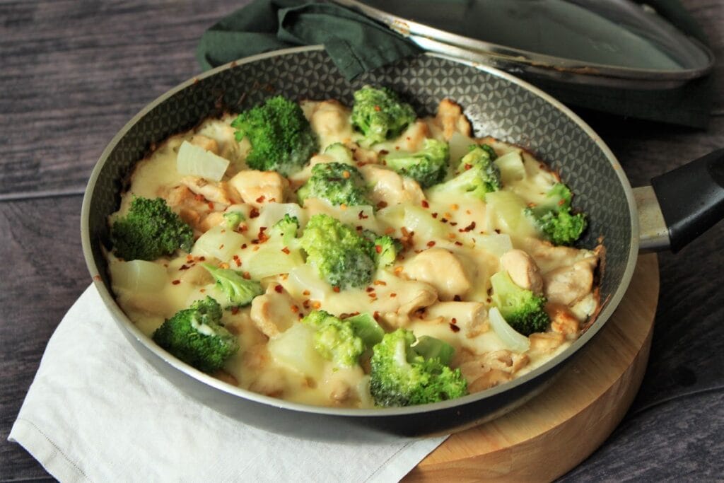 – Frite até que o frango doure bem e o brócolis fique macio. – Adicione requeijão a gosto, até ficar cremoso e sirva.
