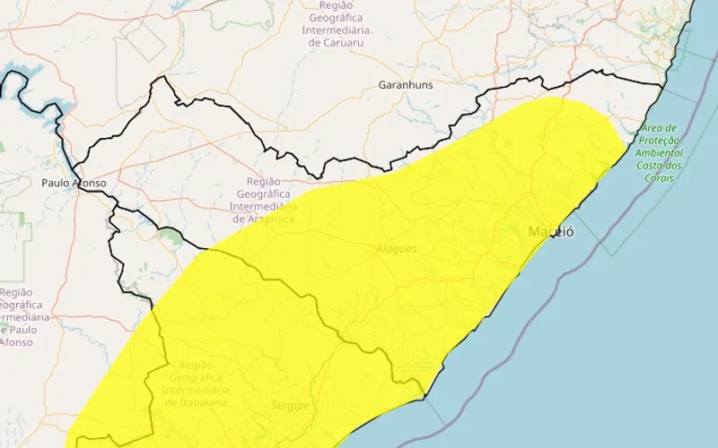 Classificado como “perigo potencial”, o alerta amarelo abrange as regiões Sertão, Agreste e Leste de Alagoas. De acordo com o Inmet, os seguintes municípios podem esperar chuvas hoje: Anadia, Arapiraca, Atalaia, Barra de Santo Antônio, Barra de São Miguel, Batalha, Belém, Belo Monte, Boca da Mata, Branquinha, Cacimbinhas, Cajueiro, Campo Alegre, Campo Grande, Capela, Chã Preta, Coité do Nóia, Colônia Leopoldina, Coqueiro Seco, Coruripe, Craíbas, Estrela de Alagoas, Feira Grande, Feliz Deserto, Flexeiras, Girau do Ponciano, Ibateguara, Igaci, Igreja Nova, Jacaré dos Homens, Jaramataia, Jequiá da Praia, Joaquim Gomes, Jundiá, Junqueiro, Lagoa da Canoa, Limoeiro de Anadia, Maceió, Major Isidoro, Marechal Deodoro, Maribondo, Mar Vermelho, Matriz de Camaragibe, Messias, Monteirópolis, Murici, Novo Lino, Olho d’Água das Flores, Olho d’Água Grande, Olivença, Palestina, Palmeira dos Índios, Pão de Açúcar, Paripueira, Passo de Camaragibe, Paulo Jacinto, Penedo, Piaçabuçu, Pilar, Pindoba, Porto Calvo, Porto de Pedras, Porto Real do Colégio, Quebrangulo, Rio Largo, Roteiro, Santa Luzia do Norte, Santana do Mundaú, São Brás, São José da Laje, São Luís do Quitunde, São Miguel dos Campos, São Miguel dos Milagres, São Sebastião, Satuba, Tanque d’Arca, Taquarana, Teotônio Vilela, Traipu, União dos Palmares e Viçosa.