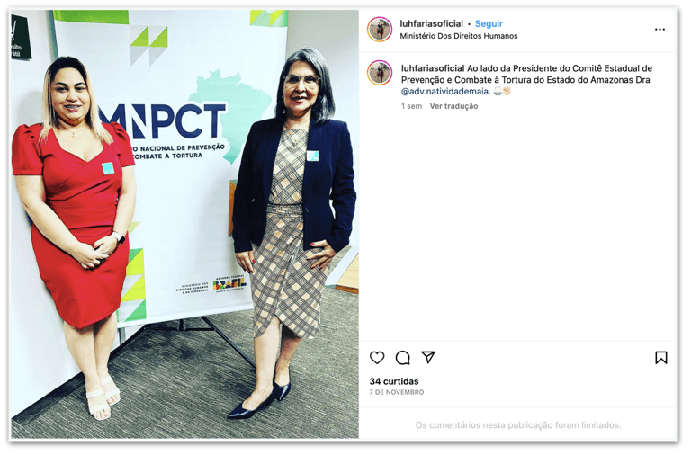 Luciane compartilhou sua participação no evento do Ministério dos Direitos Humanos em publicação no Instagram. Em um dos registros, ela aparece ao lado da presidente do Comitê Estadual de Prevenção e Combate à Tortura do Estado do Amazonas, a advogada Natividade Maia.