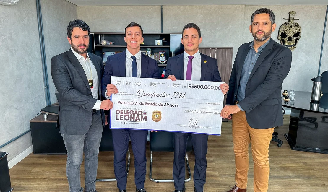“Este valor irá ajudar no fortalecimento a categoria que tem um papel importante na investigação e na elucidação de crimes em nosso Estado” O deputado Delegado Leonam (União Brasil) reforçou seu compromisso com a segurança pública do Estado e destinou R$ 500 mil para a Polícia Civil do Estado de Alagoas. Nesta quarta-feira, 28, o parlamentar esteve na sede da delegacia-geral de Polícia e foi recebido pelo delegado-geral, Gustavo Xavier e pelos delegados Eduardo Melo e Daniel Mayer. Na ocasião, o parlamentar entregou um cheque simbólico com o valor de sua emenda, que é impositiva, e será liberada posteriormente pelo Governo do Estado.