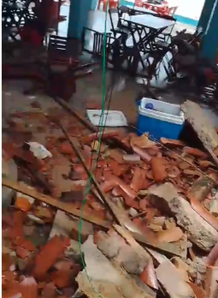 Um vídeo gravado no local mostra o estrago causado pela forte ventania. Parte do teto do estabelecimento caiu e os restos de telha, espalhados pelo chão.