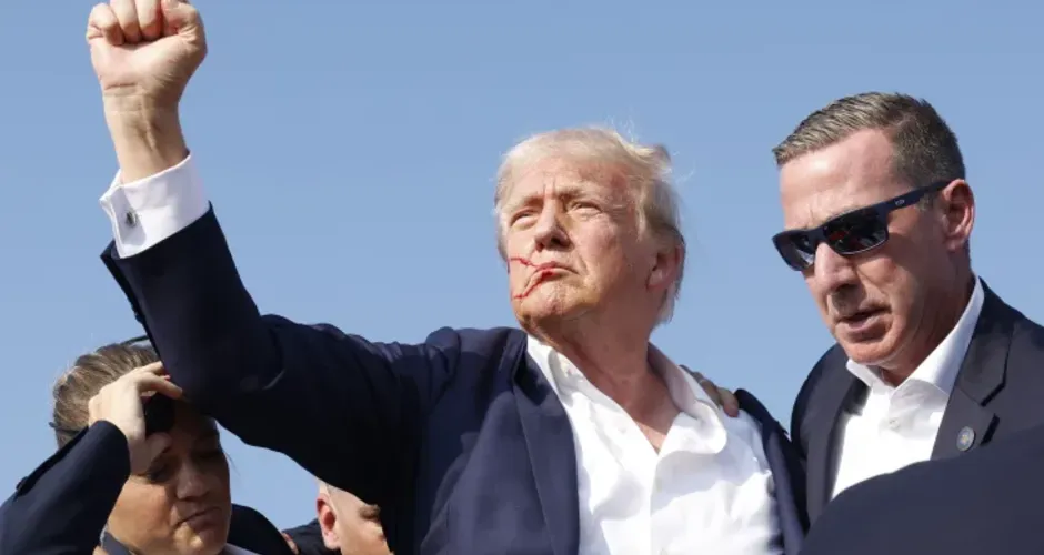 Ele saiu com um ferimento na orelha e estava sangrando. Também gritou de volta para a multidão e ergueu o punho.