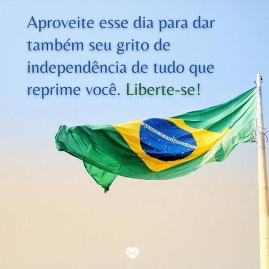 Brasil, terra adorada, neste Dia da Independência, reafirmamos nosso compromisso com um futuro próspero. O grito de liberdade ecoa, inspirando-nos a construir um Brasil mais justo e igualitário. Celebre a independência erguendo a bandeira da paz, do amor e da esperança.