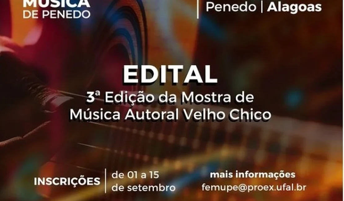 Compositores e intérpretes alagoanos já estavam na expectativa, não é não? Pois bem, a espera acabou porque o Festival de Música de Penedo (Femupe) da Universidade Federal de Alagoas lançou o edital da 3ª Mostra de Música Autoral do Velho Chico. Fiquem ligados porque as inscrições vão até 15 de setembro, exclusivamente pela internet.