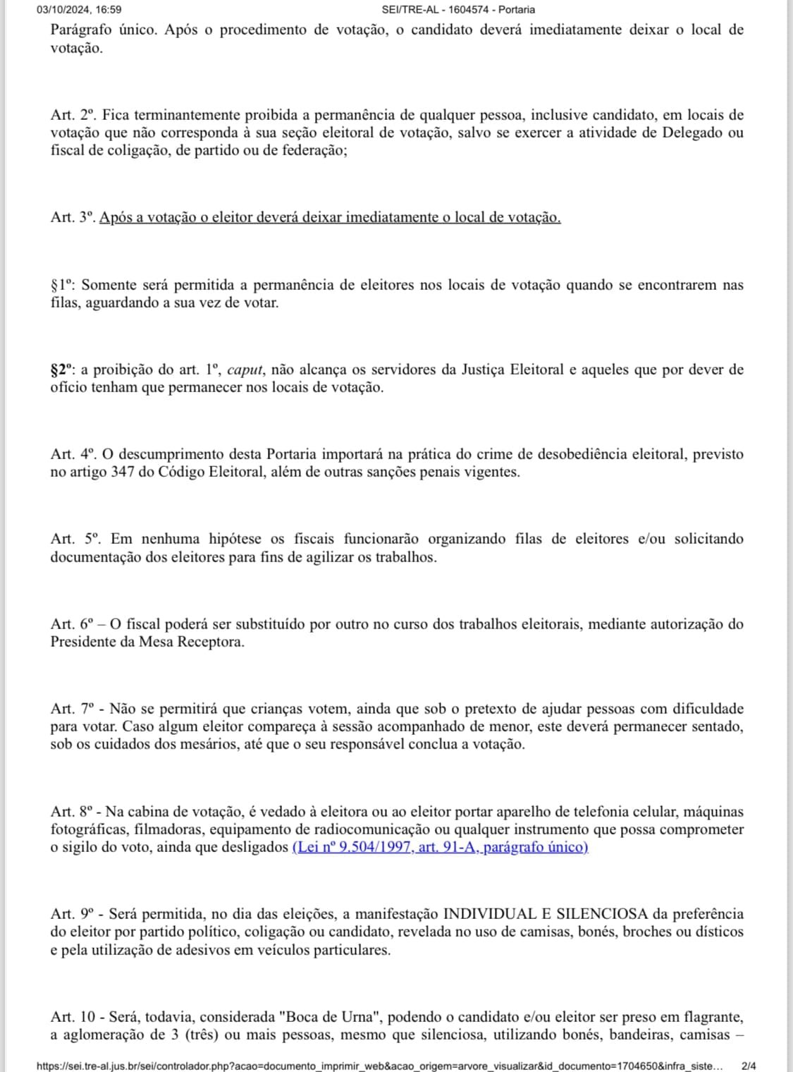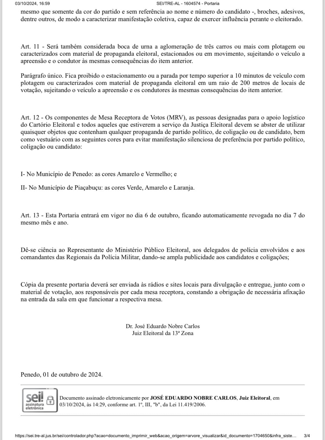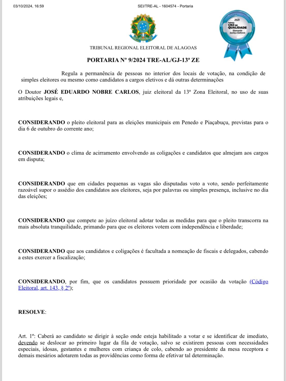 O Tribunal Regional Eleitoral de Alagoas (TRE-AL) divulgou a portaria 09/2024, assinada pelo Juiz Eleitoral Dr. José Eduardo Nobre Carlos, da 13ª Zona Eleitoral, com o intuito de informar eleitores e candidatos sobre as diretrizes a serem seguidas durante o pleito eleitoral. A medida surge em um contexto de crescente tensão entre coligações e candidatos nas disputas nas cidades de Penedo e Piaçabuçu.