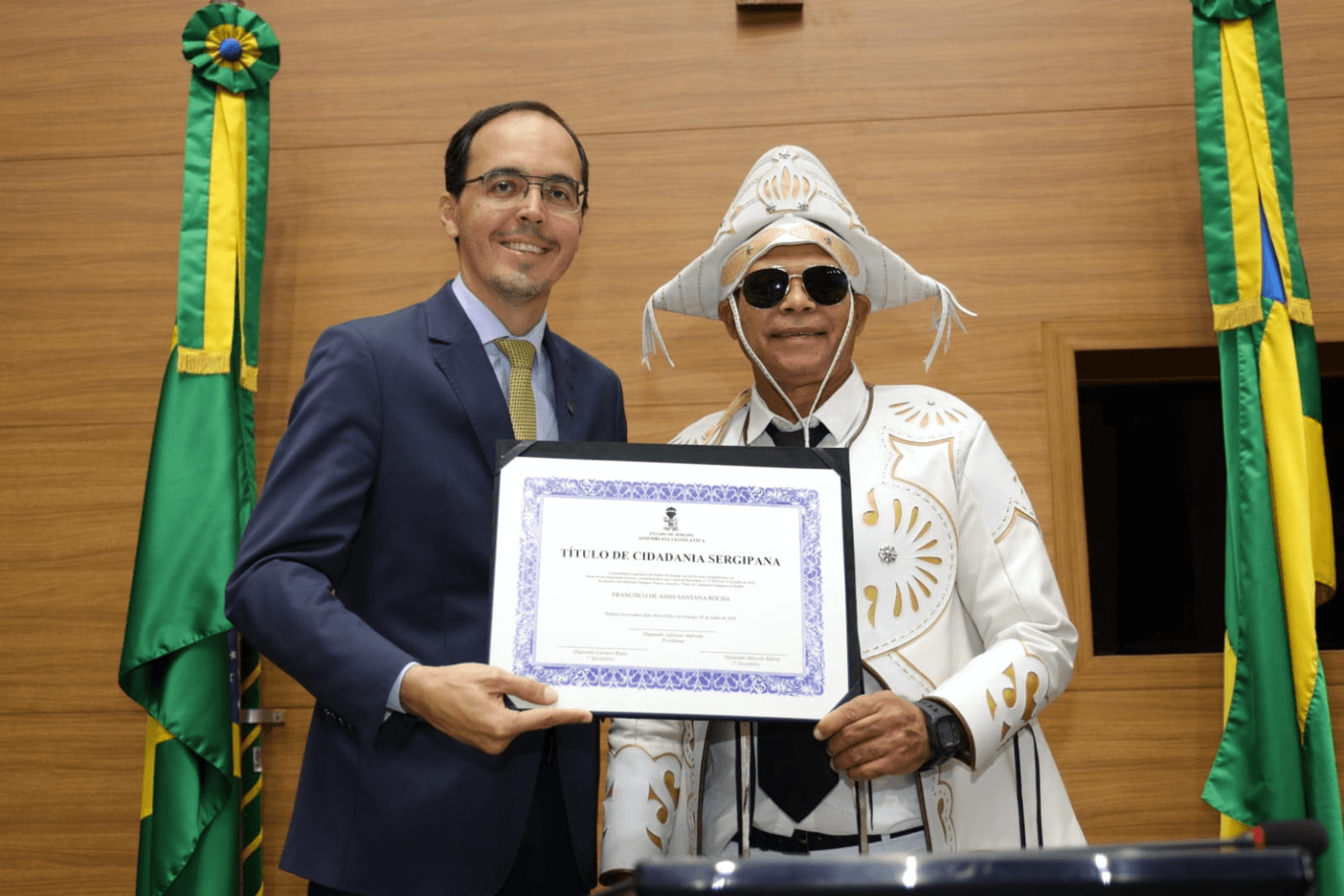 “Santana merece esse reconhecimento não apenas pela sua trajetória exemplar como militar da Força Aérea Brasileira e músico da Aeronáutica, mas principalmente por sua entrega à cultura popular nordestina. Conheço Santana desde que chegou a Sergipe, e posso afirmar: ele não é apenas um artista, é um verdadeiro pesquisador e guardião da obra de Luiz Gonzaga. Sua dedicação vai além do palco. Ele mergulha na história, percorre os caminhos de Gonzaga, conhece a família, os amigos, e mantém com todos uma relação de profundo respeito e amizade. É quase um sacerdócio cultural. Ele vive essa identidade com autenticidade e paixão. Por isso, parabenizo a Assembleia Legislativa e agradeço ao deputado Georgeo Passos por reconhecer o valor de alguém que já era sergipano de coração e que agora é, oficialmente, sergipano de direito. É uma justa e emocionante homenagem.”