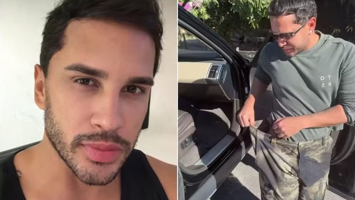Lucas Guimarães emagreceu dez quilos. O apresentador, de 31 anos, mostrou em vídeo publicado em seu Instagram neste sábado (9) a calça bem larga na cintura. “Será que eu emagreci? Está cabendo dois aqui de mim”, brincou. “Acho que perdi uns dez quilos. Estou sofrendo, viu! Estou sofrendo de amor”, comentou.