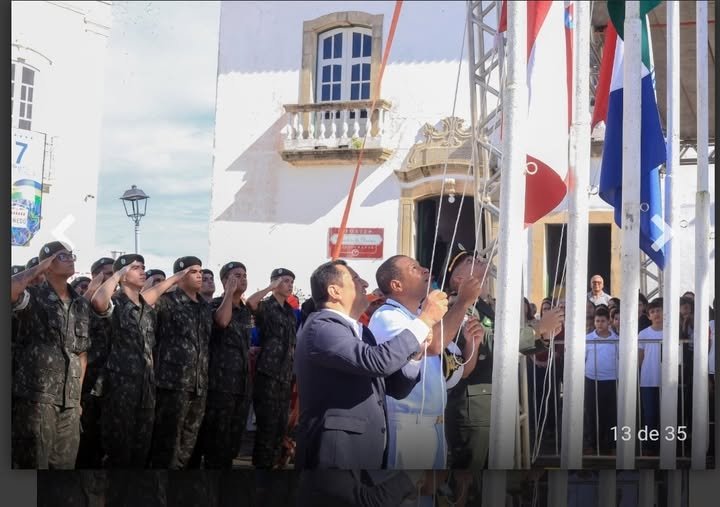 Escolas da Secretaria Municipal de Educação (SEMED) abrilhantaram a cerimônia de hasteamento dos pavilhões na Praça Barão de Penedo, Centro Histórico, com o vice-prefeito Valdinho Monteiro representando o prefeito Ronaldo Lopes.