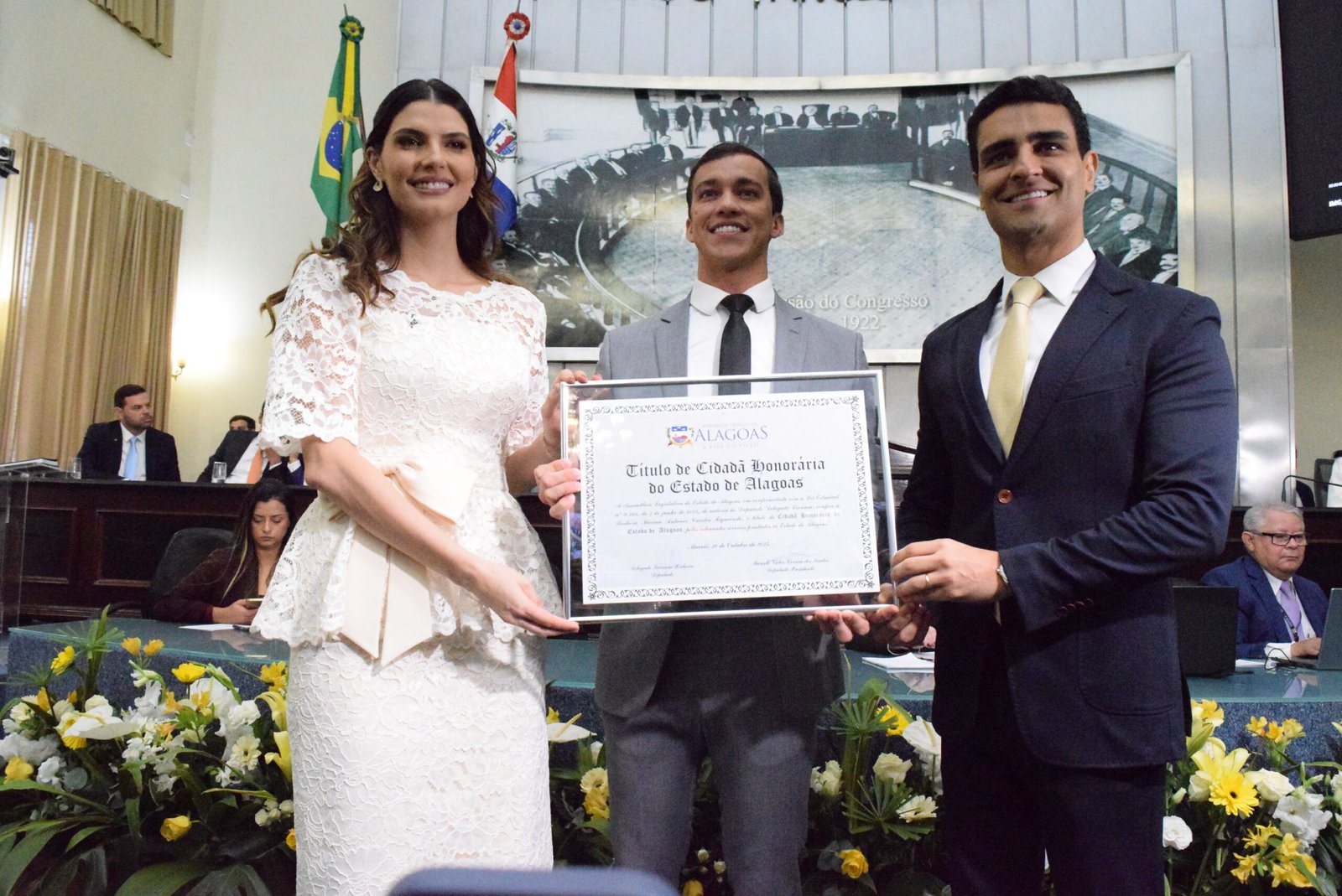 Em concorrida sessão solene proposta pelo deputado Delegado Leonam (União Brasil) a Assembleia Legislativa outorgou nesta segunda-feira, 20, o título de Cidadã Honorária de Alagoas à primeira-dama de Maceió, Marina Antunes Cândia Figueiredo, pelos relevantes serviços prestados ao Estado. A solenidade contou com as presenças do prefeito da Capital, João Henrique Caldas, o JHC; do seu vice, Rodrigo Cunha; do deputado Federal Fábio Costa (PP-AL); dos deputados Francisco Tenório (PP), Antonio Albuquerque (Republicanos); da deputada Rose Davino (PP); do procurador federal João Pedro Pinheiro; e do presidente da Câmara Municipal de Maceió, vereador Chico Filho (PL), além de representantes da sociedade alagoana.