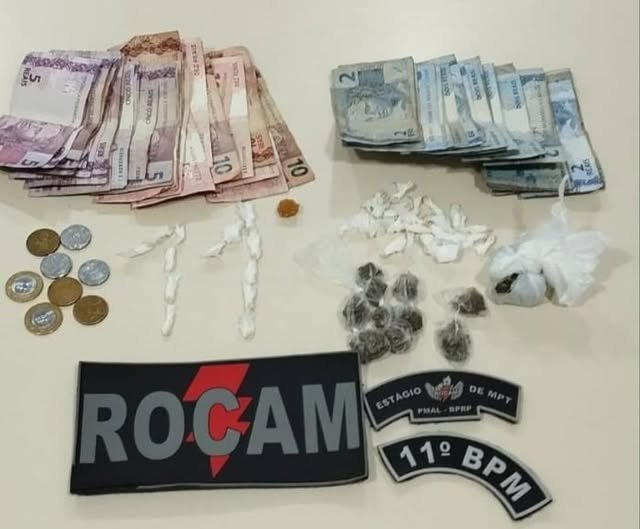 Ao perceber a aproximação da equipe policial, a suspeita dispensou um objeto no chão. Durante a busca no local, foram encontrados entorpecentes do tipo crack e maconha, além de dinheiro em espécie.