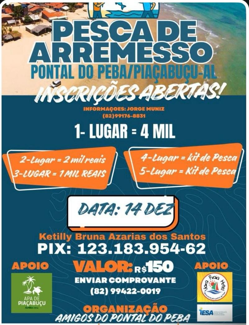 O tradicional Torneio de Pesca de Arremesso no Pontal do Peba, em Piaçabuçu (AL), está com inscrições abertas e promete movimentar a região no dia 14 de dezembro. Organizado pelo grupo Amigos do Pontal do Peba, o evento reúne pescadores de vários municípios e já se tornou parte da cultura esportiva local.