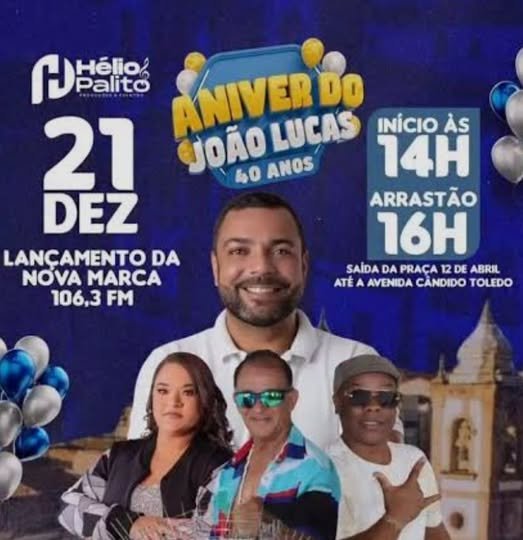 Portanto no dia 21 de dezembro, você tem um encontro marcado com João Lucas, Banda Valneijós, muito axé e Bia Martins com a comemoração em grande estilo dos 40 do radialista que se identifica com o povão. Neste mesmo cenário de festa acontecerá o lançamento da nova marca da 106,3 FM.