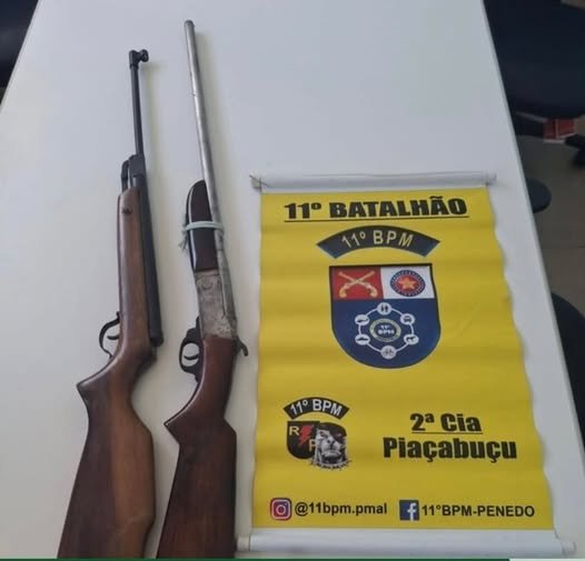 Após apresentar versões contraditórias, os policiais localizaram na residência do abordado uma espingarda calibre 20 com cartucho deflagrado e uma espingarda de pressão.
