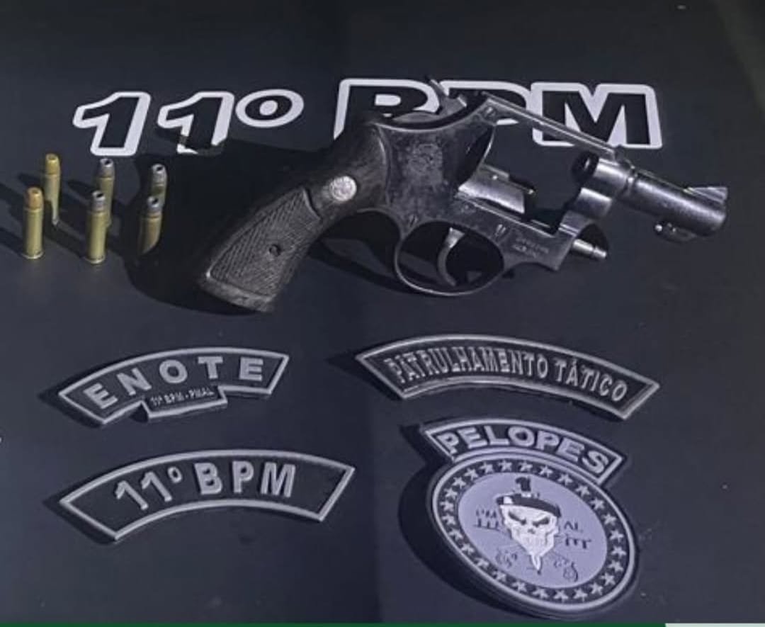 No momento da abordagem, um dos indivíduos arremessou um objeto por cima do muro. Em seguida, foi encontrado um coldre de couro em sua cintura. O suspeito confessou ser proprietário de um revólver calibre .38, municiado com 06 munições, localizado posteriormente sobre o telhado de uma residência.