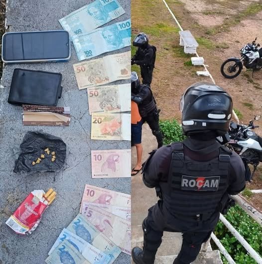 Ao ser questionado, o autor confessou a propriedade da droga e do dinheiro. Diante do flagrante, foi dada voz de prisão, não sendo necessário o uso de algemas. O local da ocorrência é conhecido pelas guarnições como ponto recorrente de comercialização de entorpecentes.