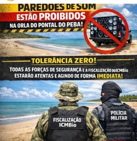 A APA de Piaçabuçu INFORMA, DETERMINA E ADVERTE que, DURANTE TODO O PERÍODO DO CARNAVAL, é TERMINANTEMENTE PROIBIDA a entrada, instalação ou permanência de PAREDÕES DE SOM E SONS AUTOMOTIVOS, bem como de quaisquer equipamentos sonoros similares, na orla do Pontal do Peba.