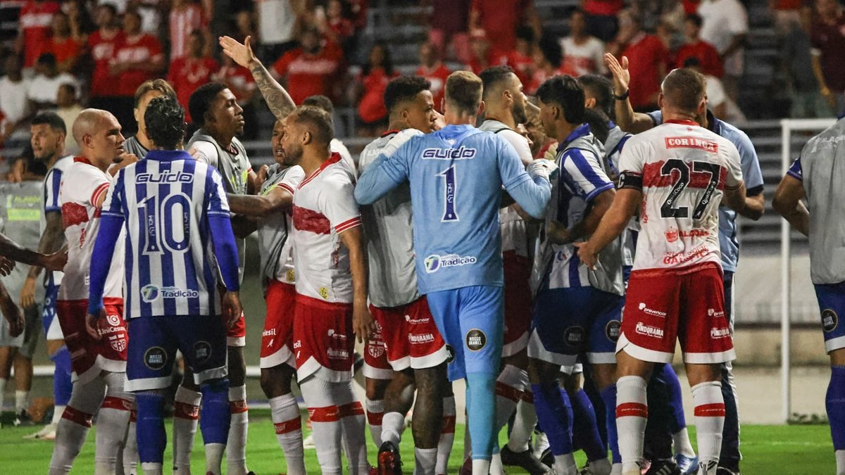 Mikael foi celebrar em direção à torcida azulina, e os jogadores do CSA não gostaram. Uma confusão se instaurou e, após análise do VAR, o árbitro Ramon Abatti Abel expulsou o centroavante do CRB por um soco.