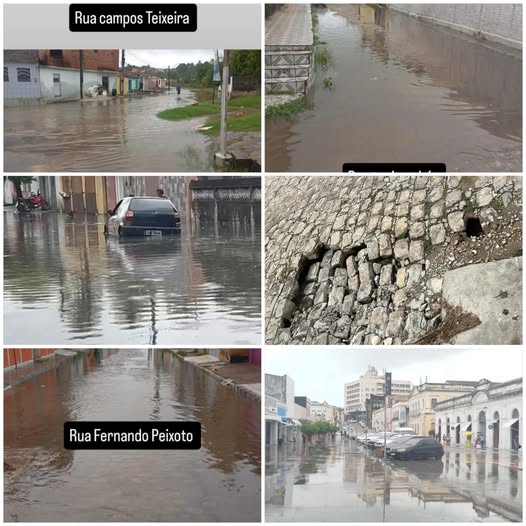Fotos e vídeos enviados a redação deste portal de noticia mostram as ruas que ficaram completamente tomadas pela água, dificultando o deslocamento de motoristas e pedestres em várias localidades como Ulisses Batingas, Campos Teixeira, Rua Sucupira no Camartelo, Fernando Peixoto, Tupinambás, Feira do Peixe e para variar como já é de praxe a feira livre. Isso, só na parte baixa da cidade.